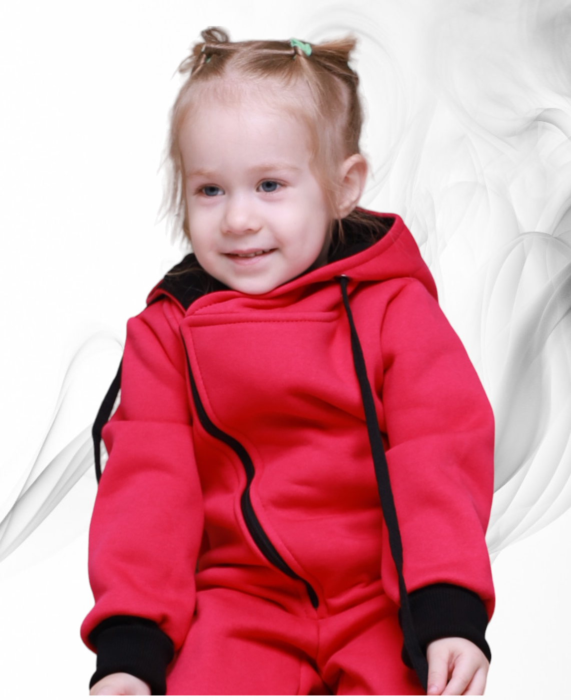 Комбинезон с капюшоном на подкладке, с открытыми ножками, рукавчики на манжете, спереди на косой молнии.
